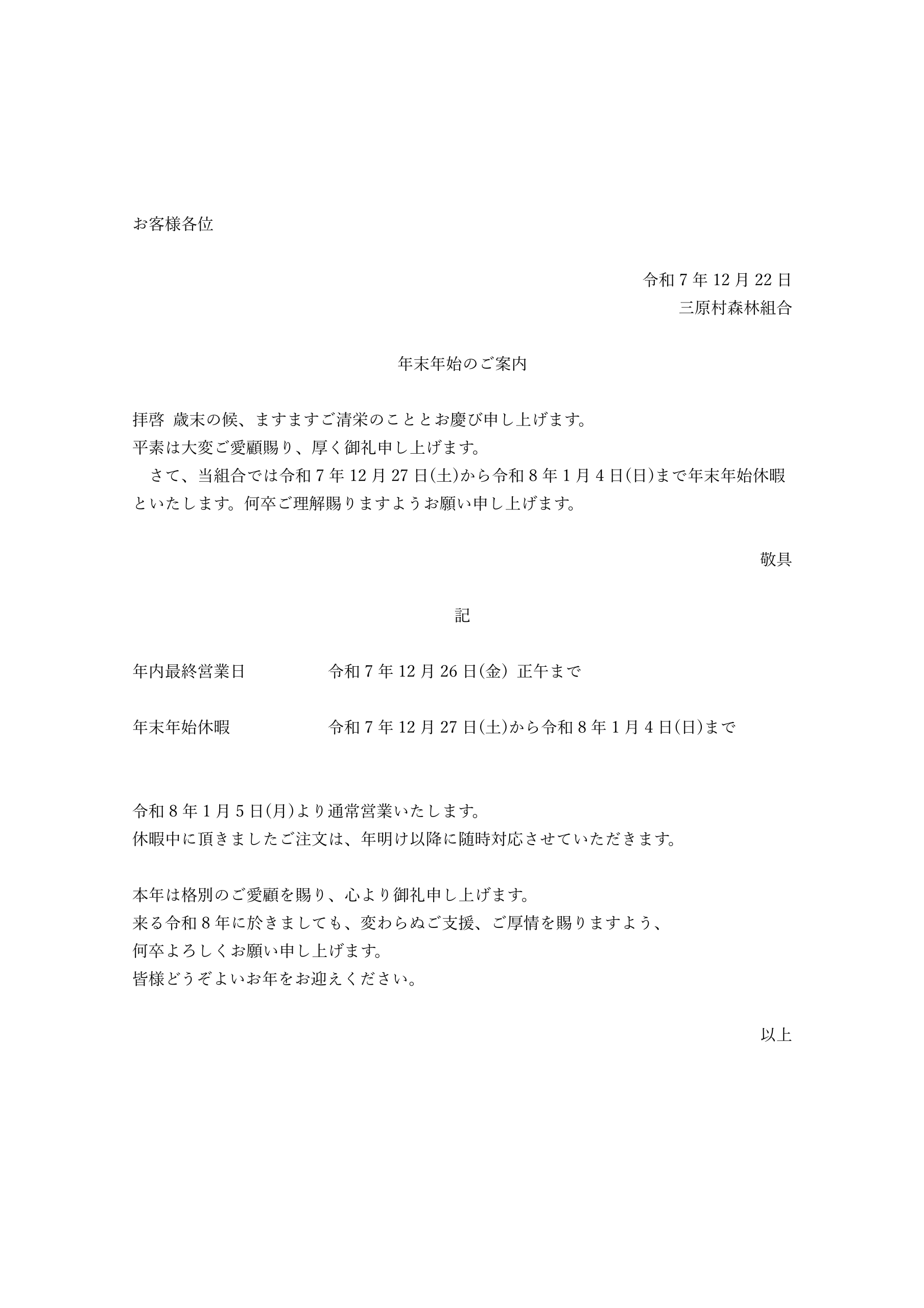 年末年始のご案内